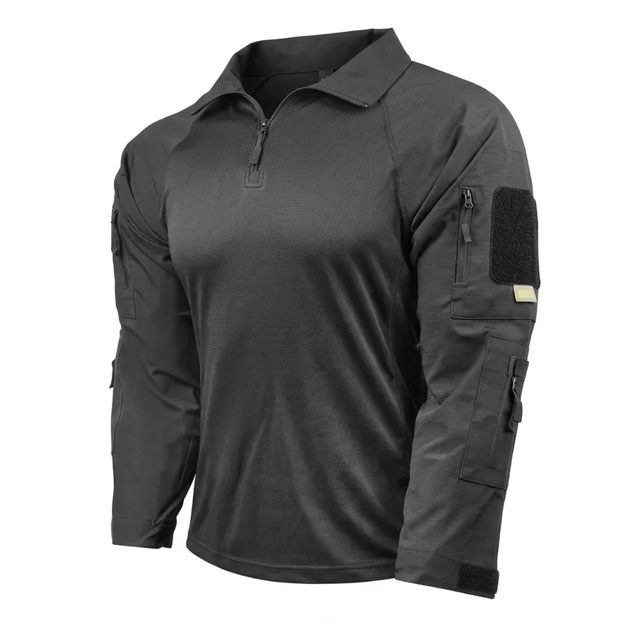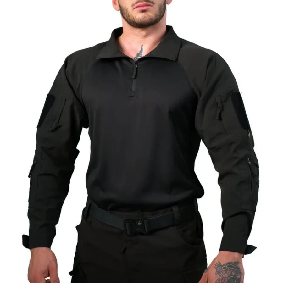 חולצה טקטית שחורה מושלמת למאבטחים שוטרים וכיתות כוננות ,החולצה נוחה ,אוורירית וגמישה , גוף החולצה עשוי בד דרייפיט מתקדם המנדף לחות ושומר על תחושת יובש לאורך זמן.