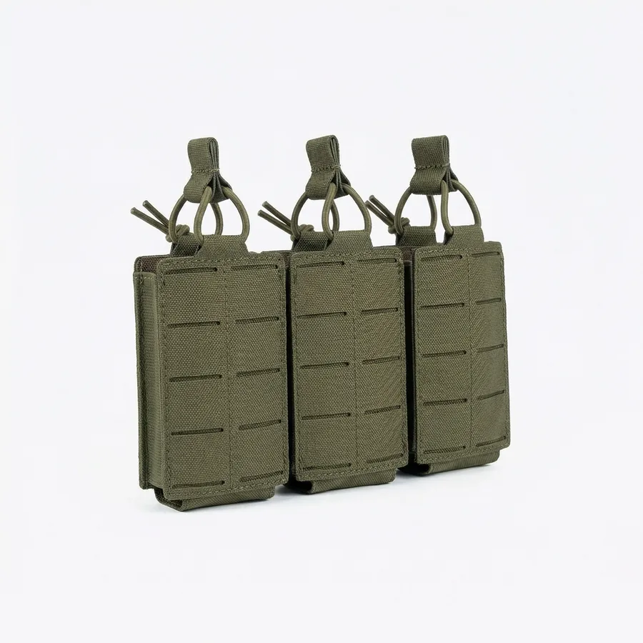 עשוי בד ניילון 1000D איכותי ועמיד במיוחד. הפאוץ’ מיועד לנשיאה נגישה ובטוחה של שלוש מחסניות על אפוד, וסט או חגורת לוחם, באמצעות חיבור MOLLE מודולרי.